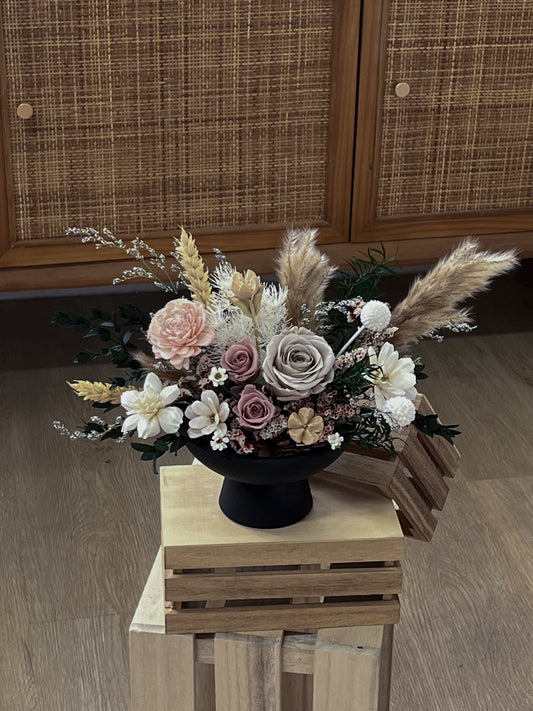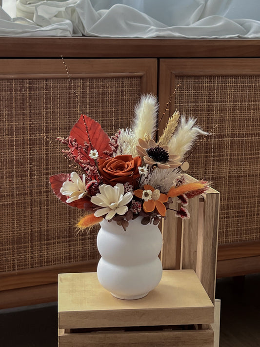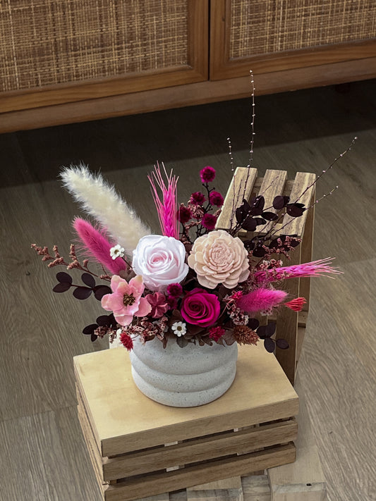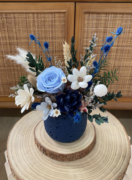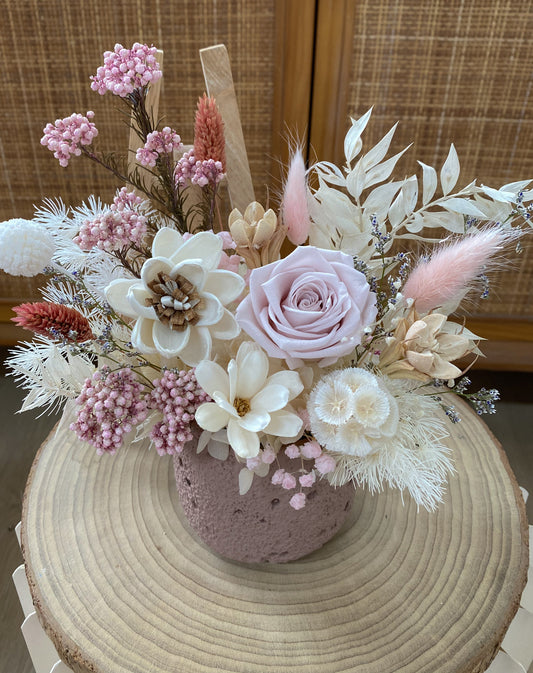 Housed in mini moon pots, each piece enhances the visual appeal of the preserved blooms.