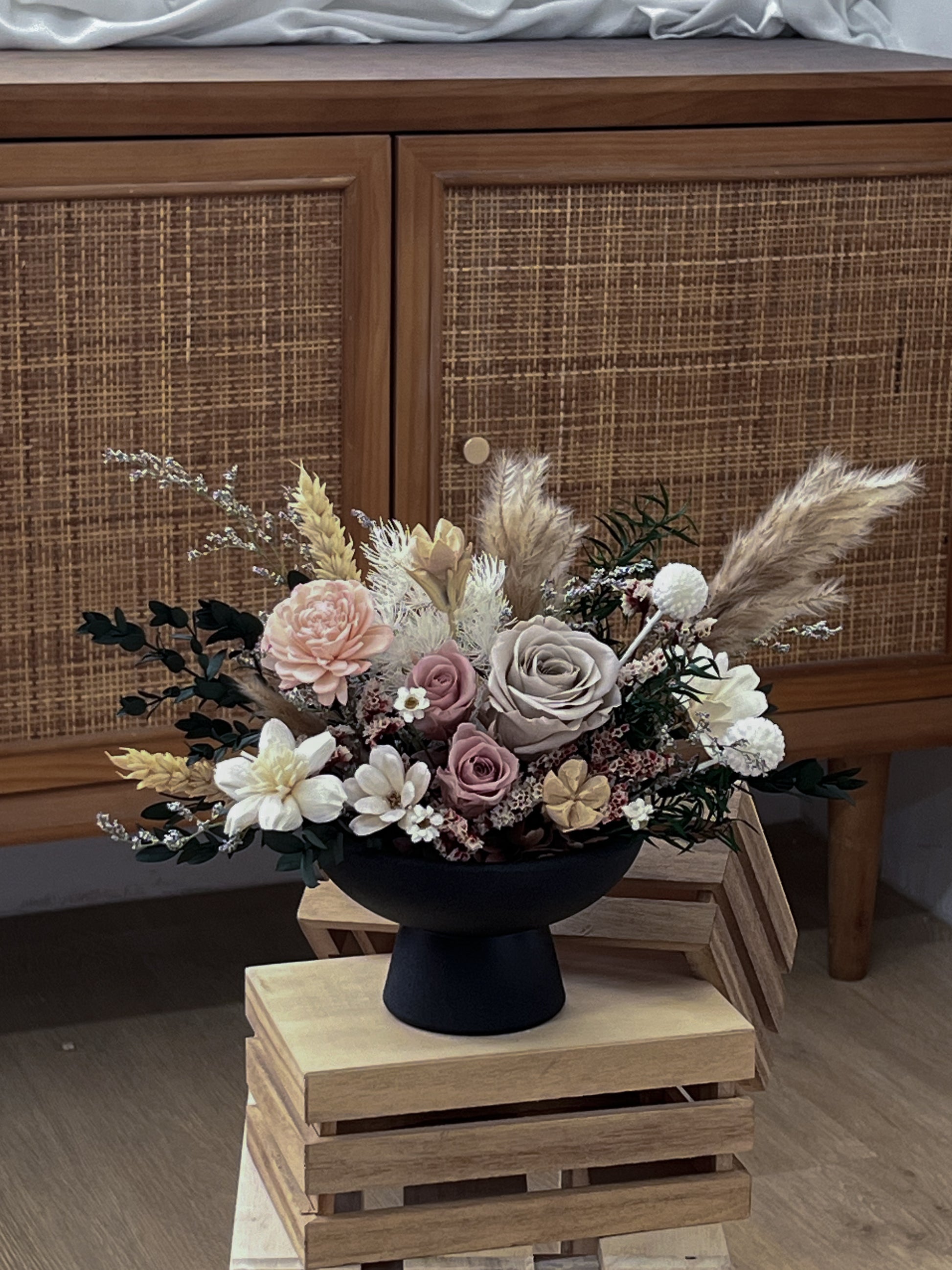 *Please note that while our flowers are designed to maintain their beauty indefinitely, they may naturally fade over an extended period of time. Nonetheless, their lasting charm will continue to captivate your heart and remind you of the everlasting nature of love. Pots are handmade and might have little imperfections!